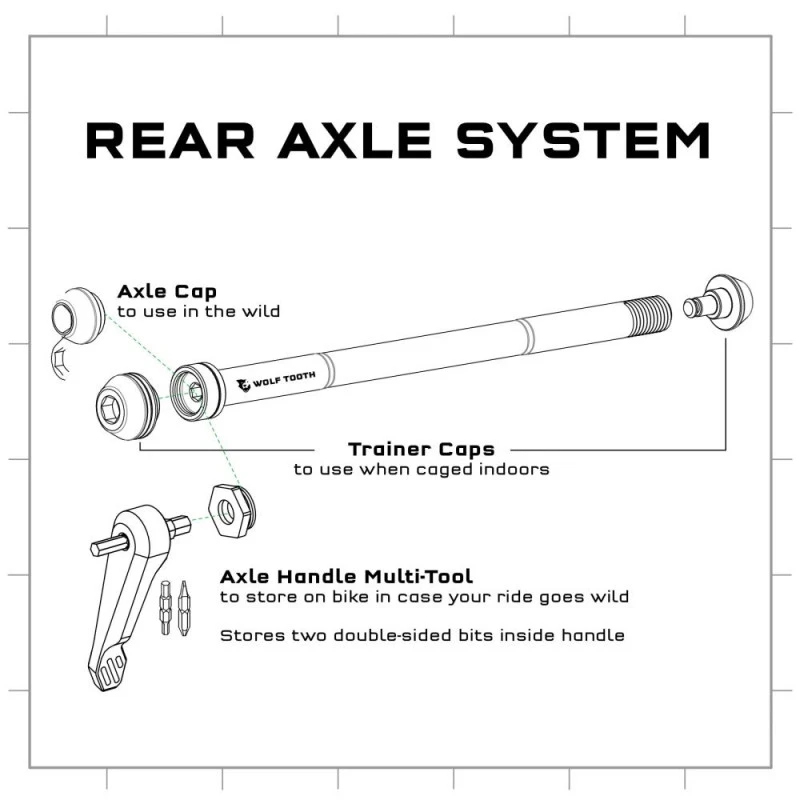 Un joint torique Ă l’intĂ©rieur de l’extrĂ©mitĂ© filetĂ©e de l’essieu verrouille l’outil multifonction pour poignĂ©e d’essieu en place afin qu’il soit sĂ©curisĂ© pendant la conduite. D’un cĂ´tĂ© de la poignĂ©e se trouve une extrĂ©mitĂ© hexagonale de 5 mm Ă©tagĂ©e Ă 6 mm plus près de la poignĂ©e qui s’insère dans l’extrĂ©mitĂ© d’un axe. L’autre cĂ´tĂ© de la poignĂ©e a une ouverture de 4 mm pour les embouts hexagonaux Ă double face qui s’emboĂ®tent Ă l’intĂ©rieur de la poignĂ©e via un aimant. Il a Ă©tĂ© conçu pour les essieux Wolf Tooth, mais est compatible avec d’autres essieux qui ont une extrĂ©mitĂ© filetĂ©e.